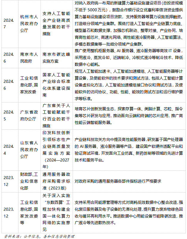 为响应国家战略,各地政府都强调在基于AI服务器和液冷服务器的基础上研发更高性能的服务器。山东省人民政府办公厅在产业链攻关方向中提出研发高性能服务器,基于国产处理器的AI服务器、液冷服务器等产品,开发先进的计算和服务平台;南京市人民政府推广使用整机柜服务器、AI服务器、液冷服务器等高效IT设备,降低数据中心能耗;杭州市人民政府指出加强高性能液冷服务器的产业集群。