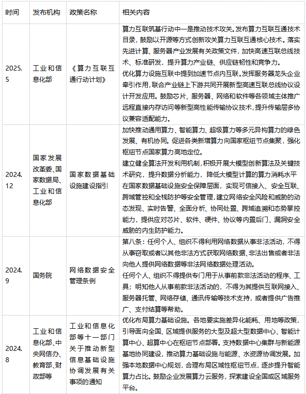 在国家政策层面,随着大数据、云计算以及人工智能等技术的普及,我国出台了一系列政策健全网络安全的法律法规、完善服务器行业的行为规范以及推动服务器行业发展的各种战略举措。在2025年颁布的《算力互联互通行动计划》指出发挥服务器龙头企业牵引作用,联合产业链上下游共同开展新型高速互联总线协议设计开发应用;《国家人工智能产业综合标准化体系建设指南》规范了服务器的技术要求和测试方法;《网络数据安全管理条例》中明确规定不得对利用网络数据从事非法活动的个人或组织提供服务器托管行为。
