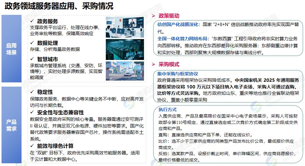 总体而言,政务、电信运营、金融领域受信创和“东数西算”驱动,正加速服务器国产化替代。政务领域服务器需求聚焦高性能、强安全、国产化和绿色化,依赖国产芯片、整机及生态构建;电信运营商服务器用于支撑网络运行等,自 2023 年起大规模采购 AI 服务器,以昇腾系为主,推动向智能化服务转型;金融领域服务器则聚焦于保障金融业务安全、稳定、低延迟和高性能运行。